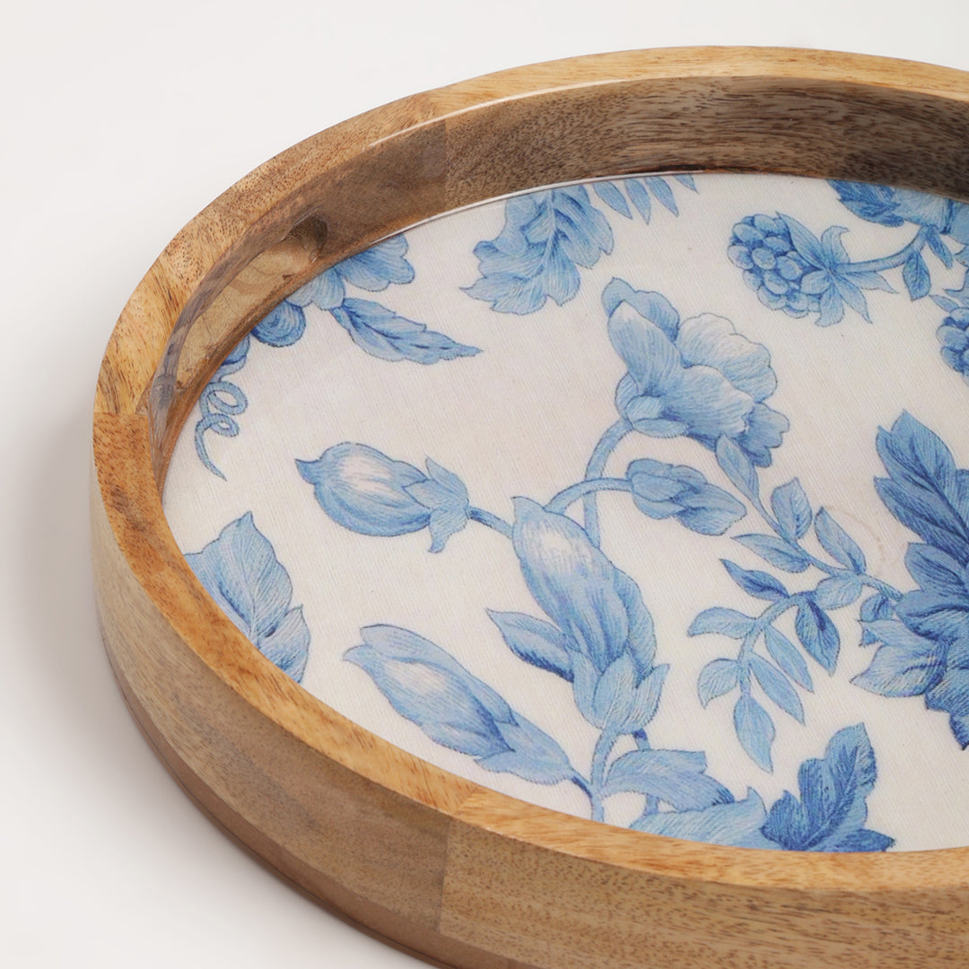 Bring beauty and function to your home with this Mango Wood Round Tray. Handcrafted from durable mango wood, each tray is decorated with a charming blue floral print that adds a fresh, elegant touch to your serveware.