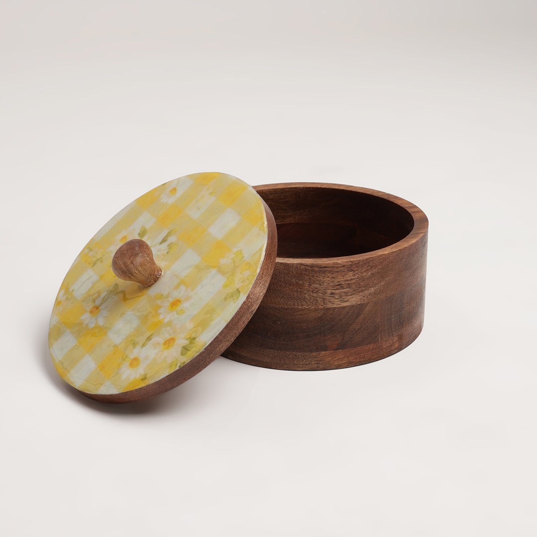 Serve your rotis fresh and warm in this mango wood roti box. Adorned with a cozy butter yellow gingham print, it adds charm to your dining table while keeping your breads neatly stored. Strong, stylish, and homely perfect for everyday meals or family gatherings.