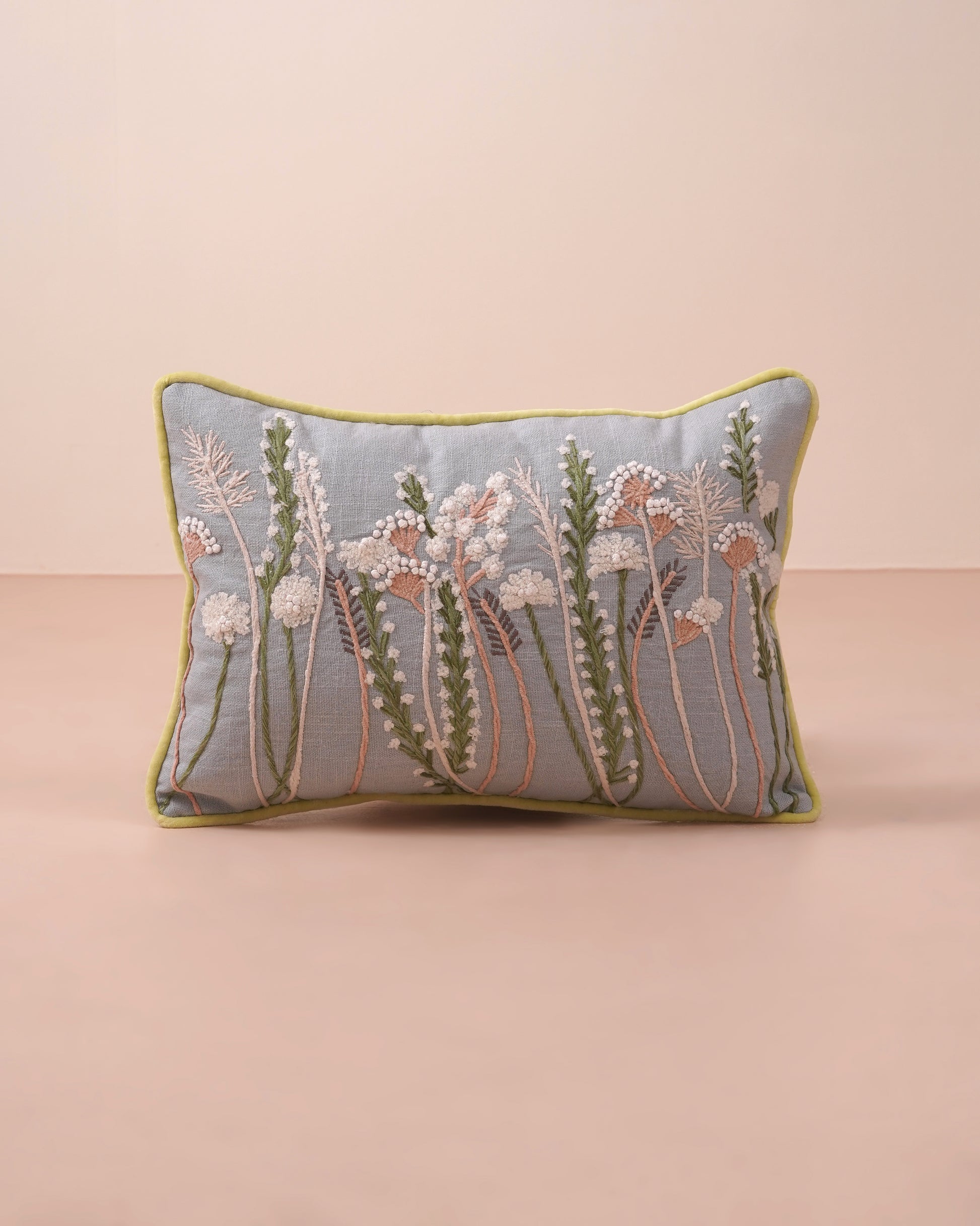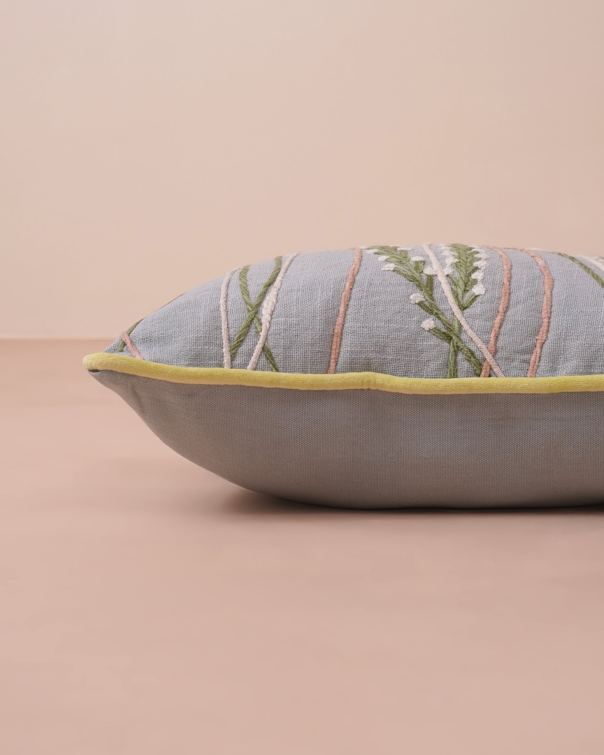 - Delicate machine-embroidered floral patterns in soothing shades of green, beige, white, grey, blue, and brown add a peaceful, natural charm to any space. Thanks to its hidden zipper, the cover stays smooth and neat while making it easy to swap cushions in and out.