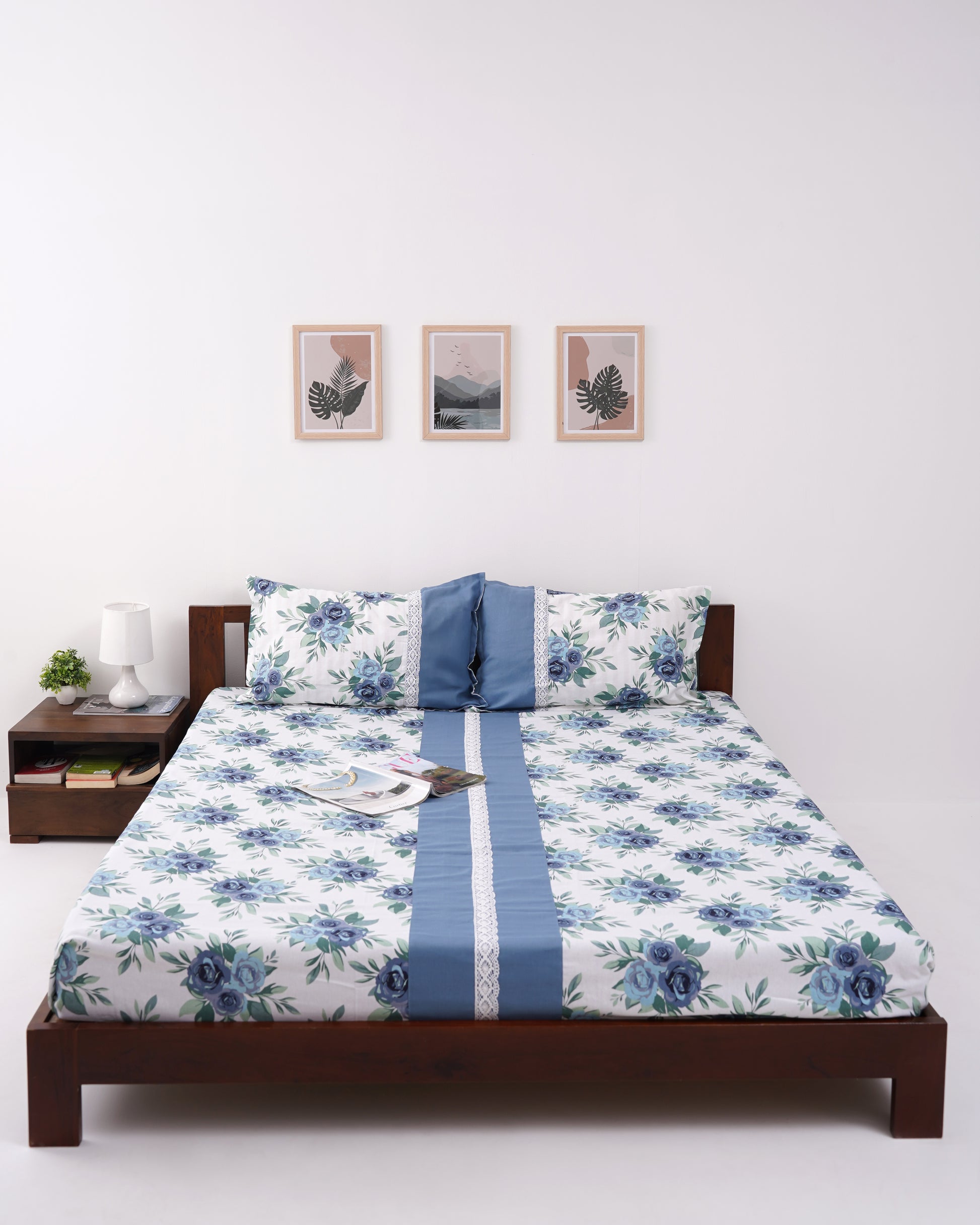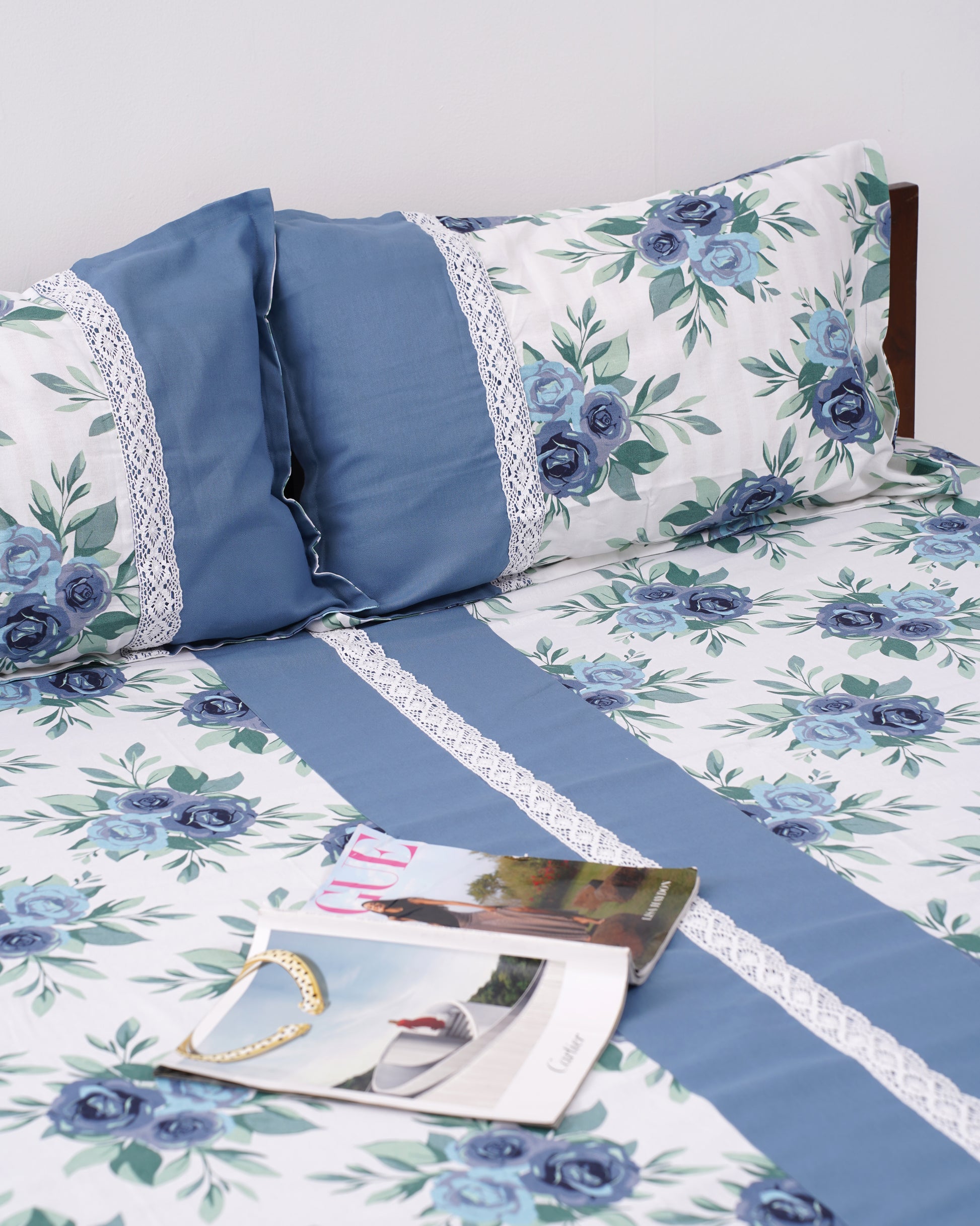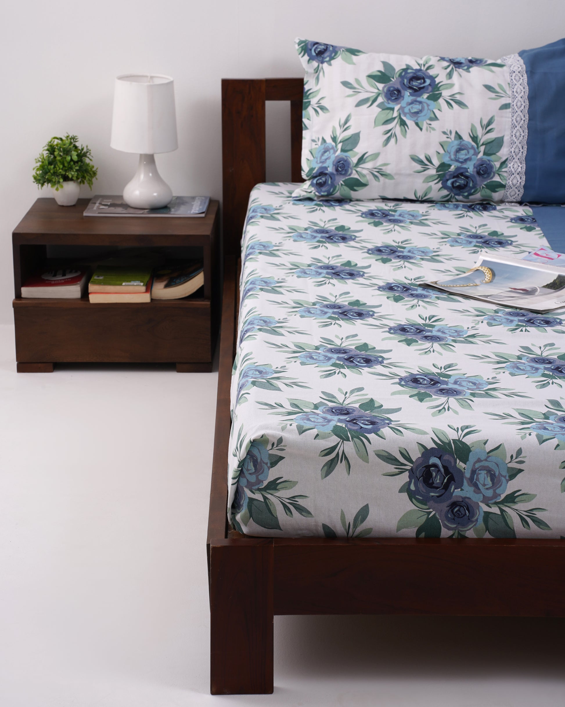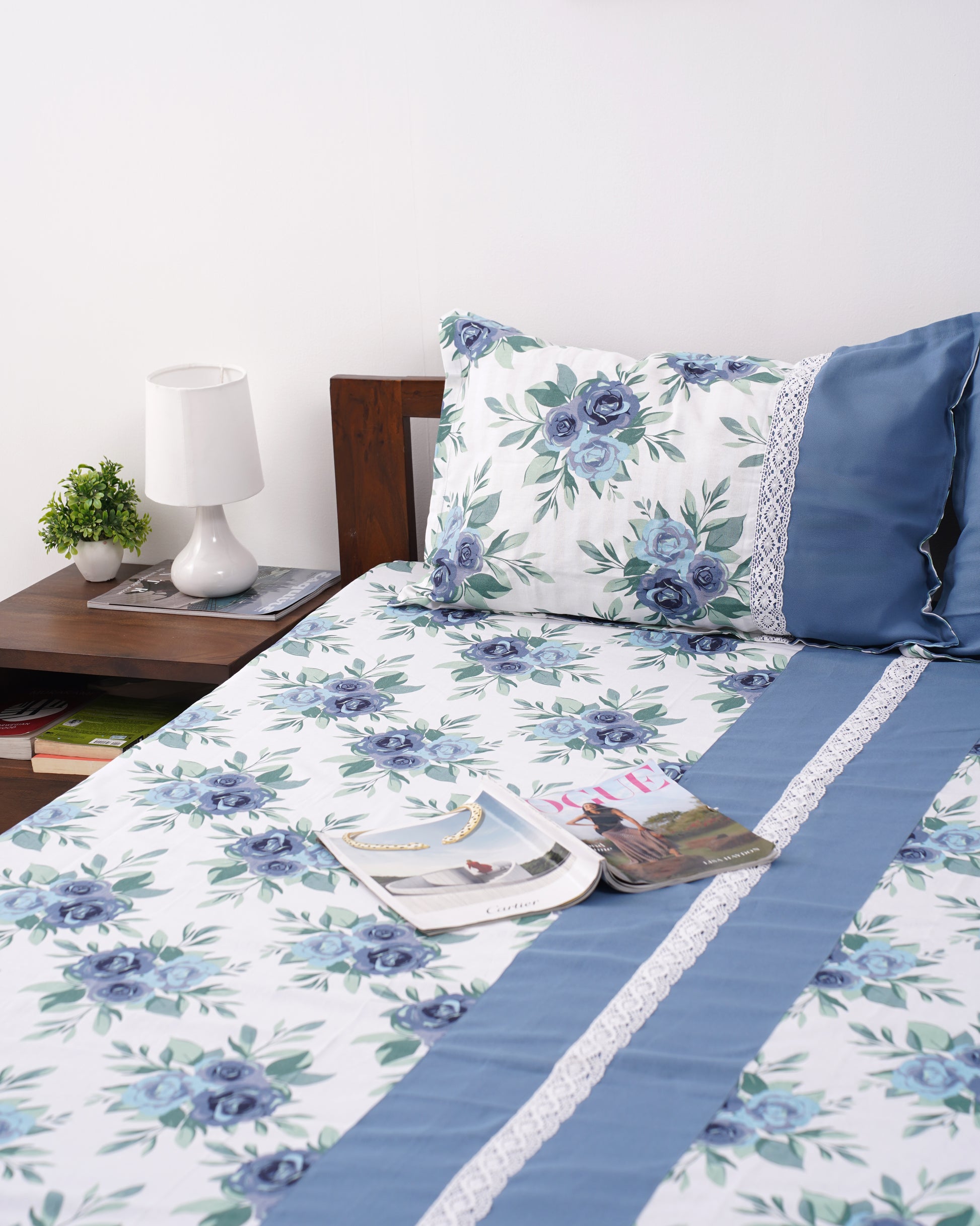 - Slip into the serene beauty of Moonlit Botanica β a bedsheet that captures the magic of wildflowers bathed in soft moonlight. Gentle blue blooms dance across a crisp white backdrop, evoking a sense of calm and understated elegance. Delicate white lace trims the edges like morning frost settling on a quiet garden at dusk.