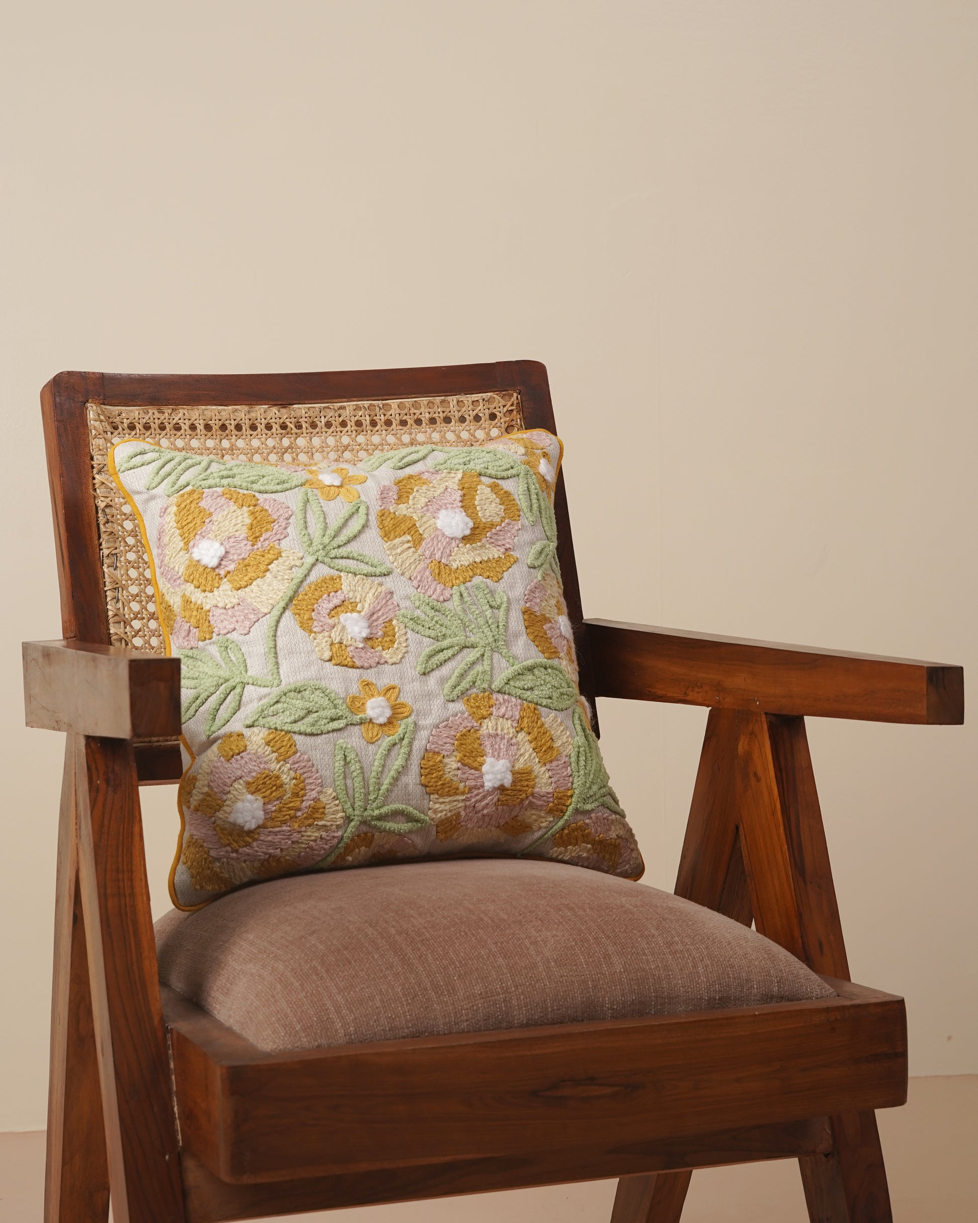 Refresh your living space with the timeless beauty of our luxurious cushion cover. Delicately handcrafted with intricate floral and leaf embroidery, it brings a touch of grandeur and elegance to your décor.
