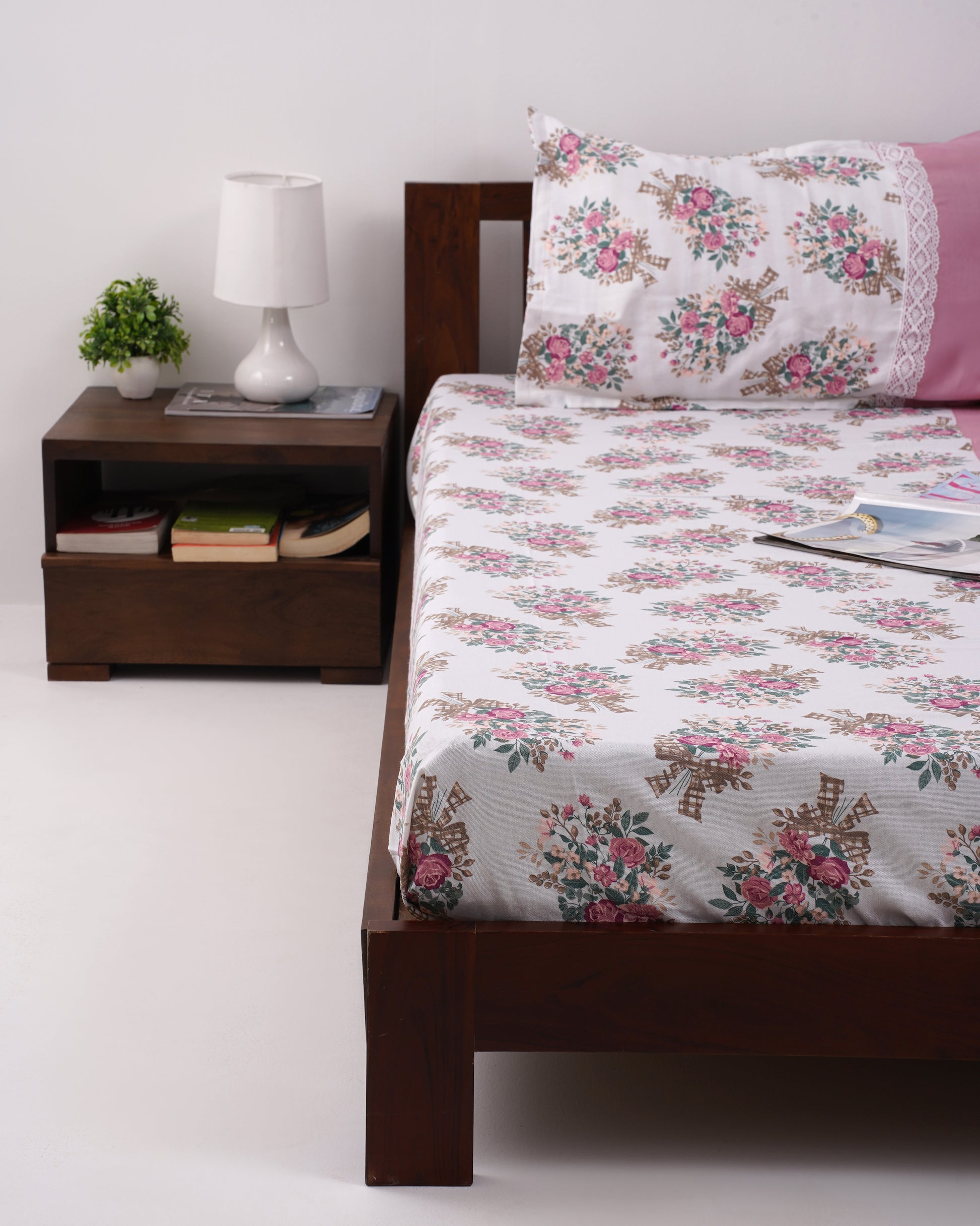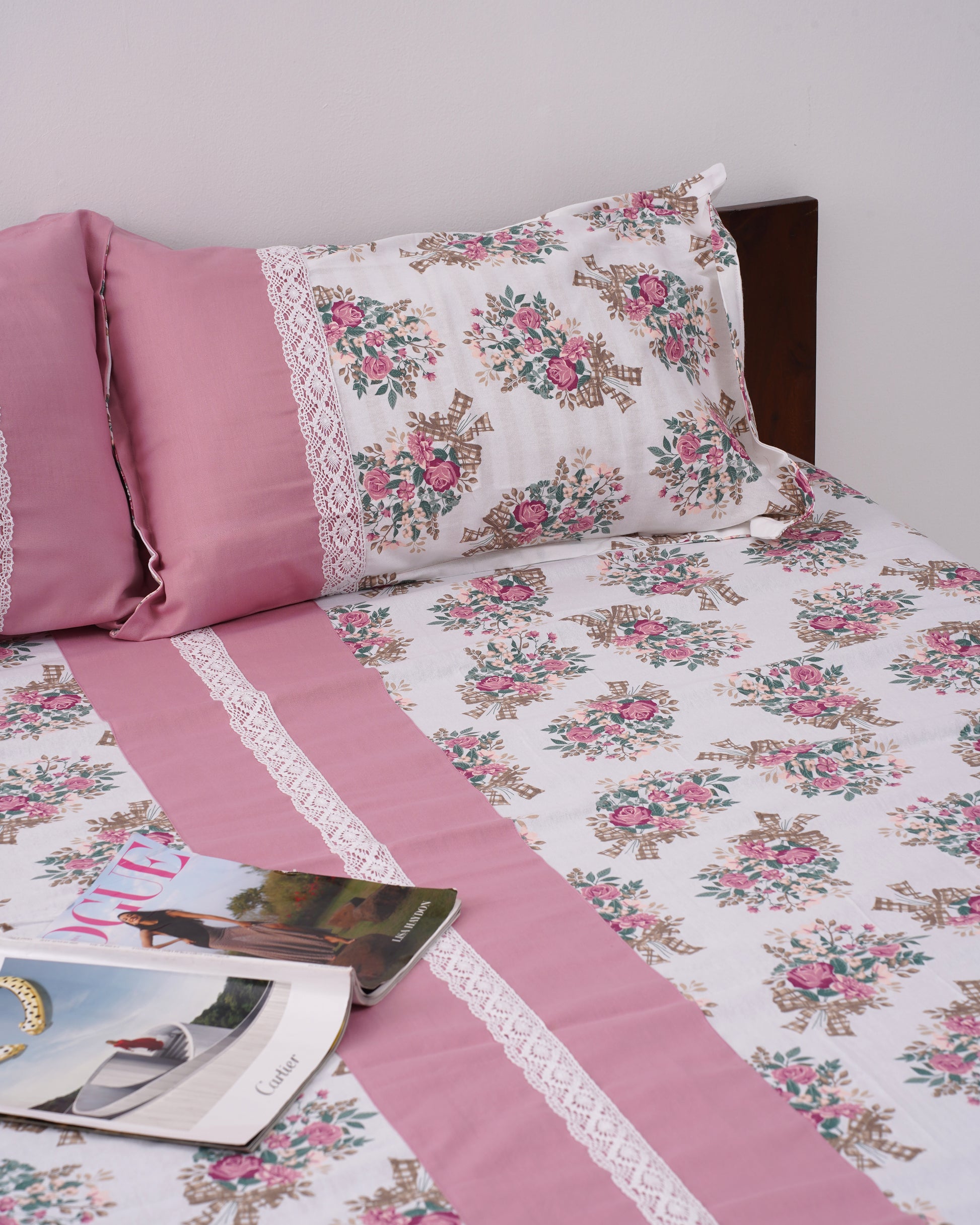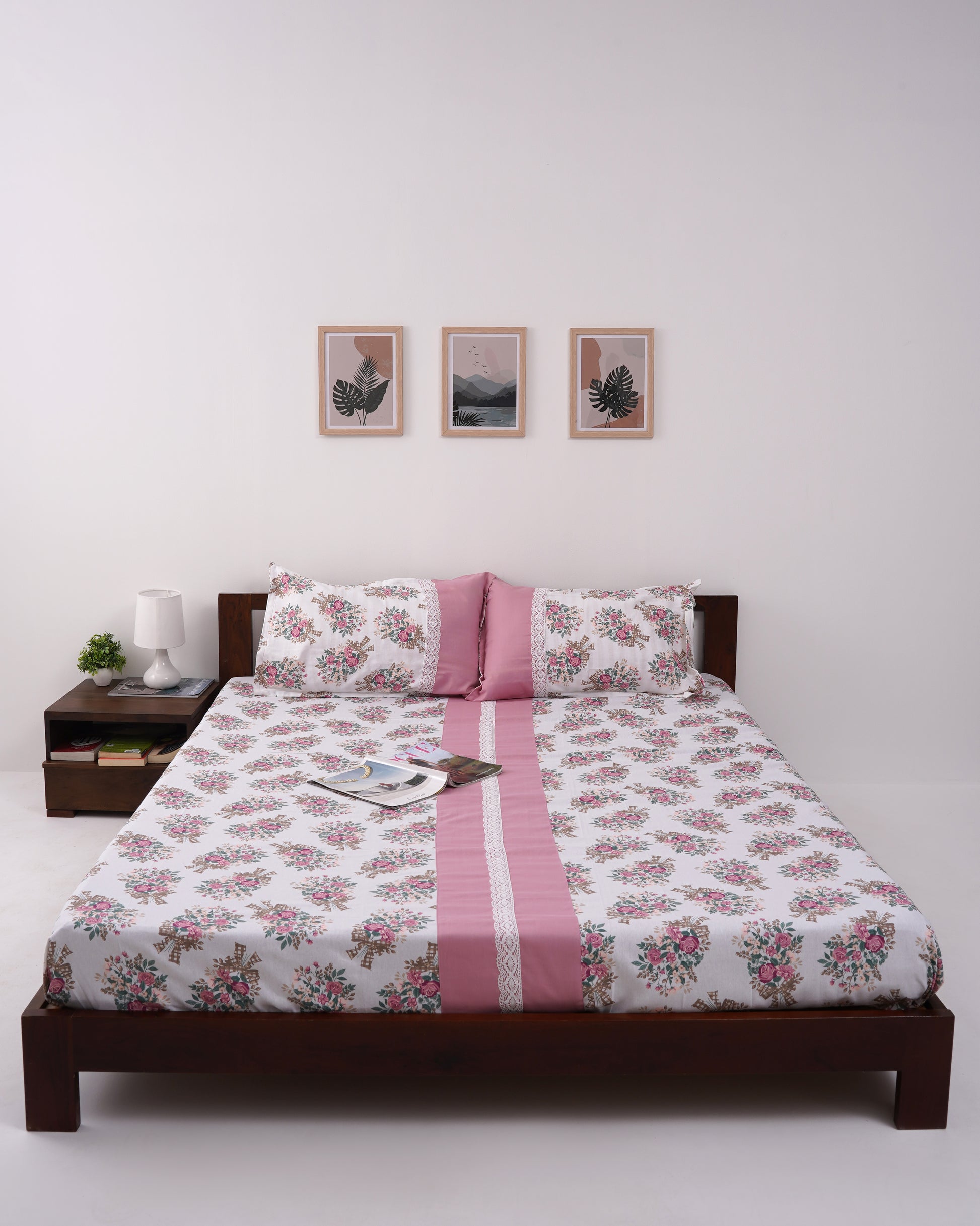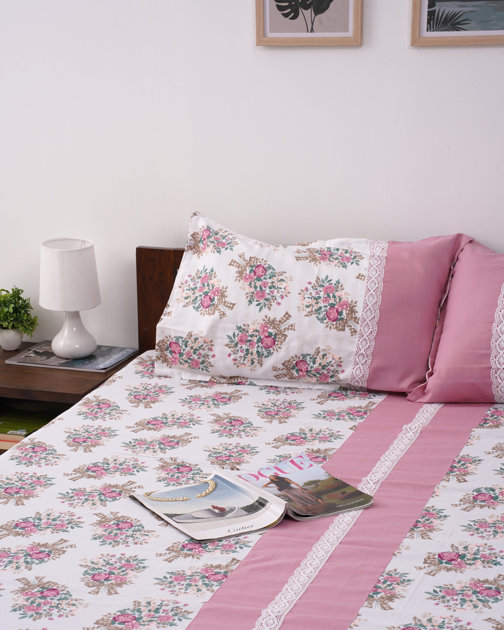 - Let your bedroom come alive with the gentle romance of Rose Poetry β a beautiful blend of delicate florals and timeless elegance. Soft pink blossoms float gracefully across a crisp white canvas, like petals carried on a spring breeze. The edges are adorned with intricate lace, adding a touch of vintage charm and feminine warmth.